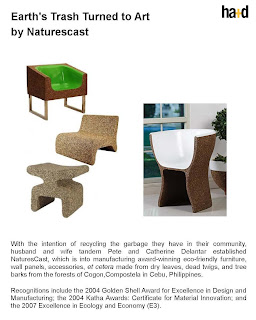 "We believe that designing an eco-friendly product starts with an understanding of your environment first. We must recognize that sustainable and renewable resources are around us," confirms Manila F.A.M.E. exhibitor Pete Delantar of Natures Legacy. Their company manufacturers artistic and functional home pieces and various outdoor accessories.